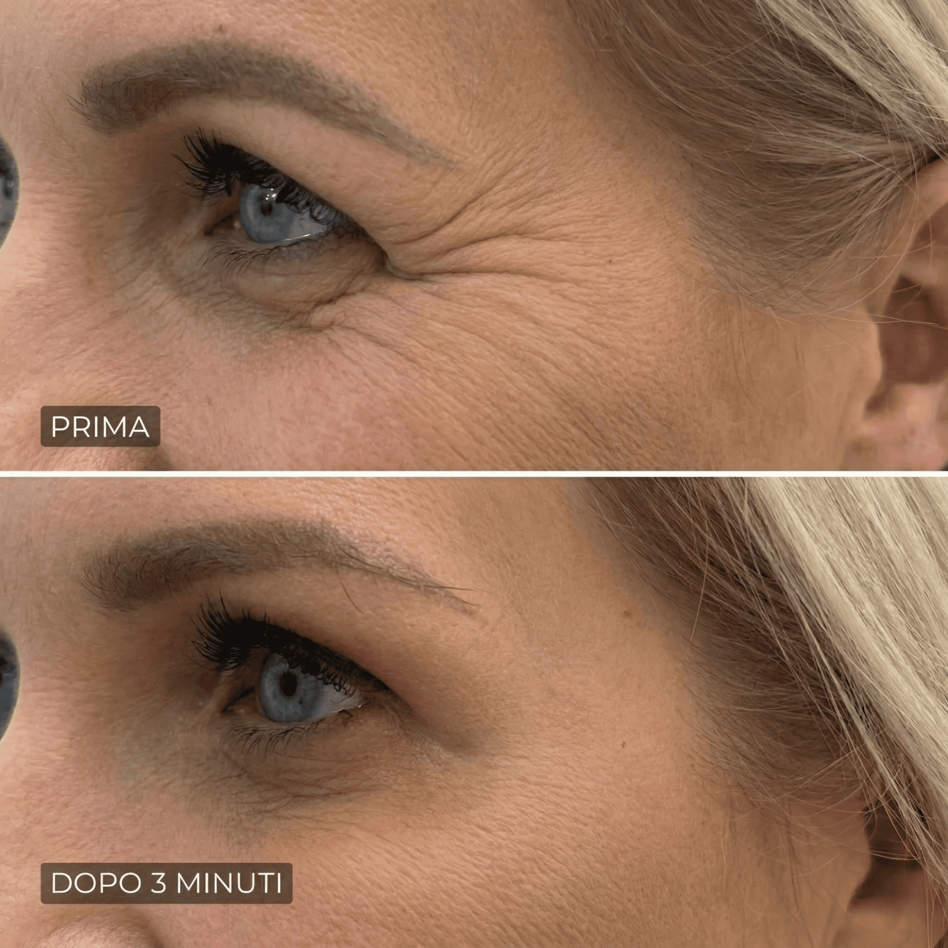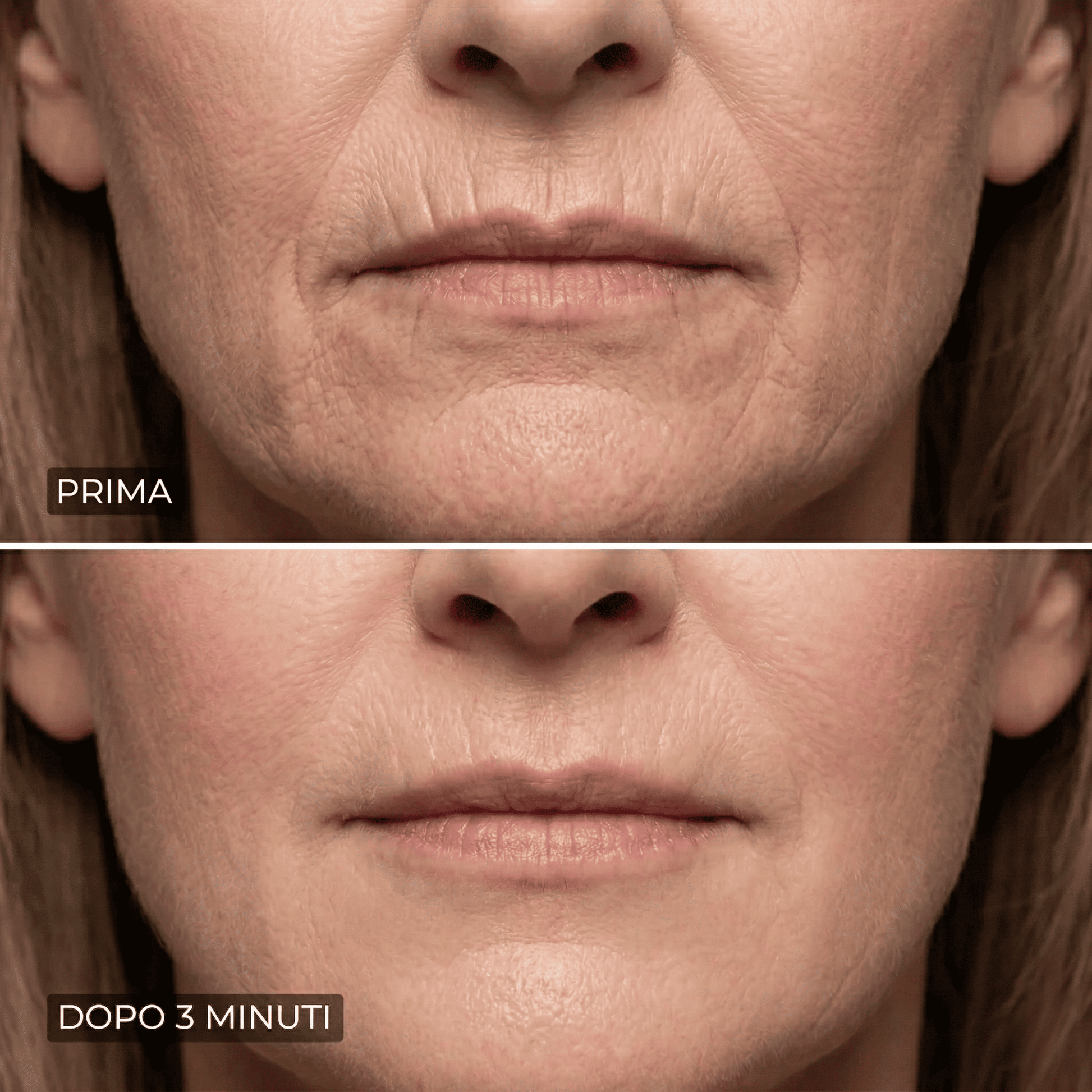 Sì, i risultati sono visibili fin dai primi minuti. Il 90% delle donne testate ha riscontrato un effetto levigante immediato durante il nostro studio clinico. Il prodotto crea un effetto tensore che leviga fisicamente l'aspetto delle rughe in pochi minuti.
