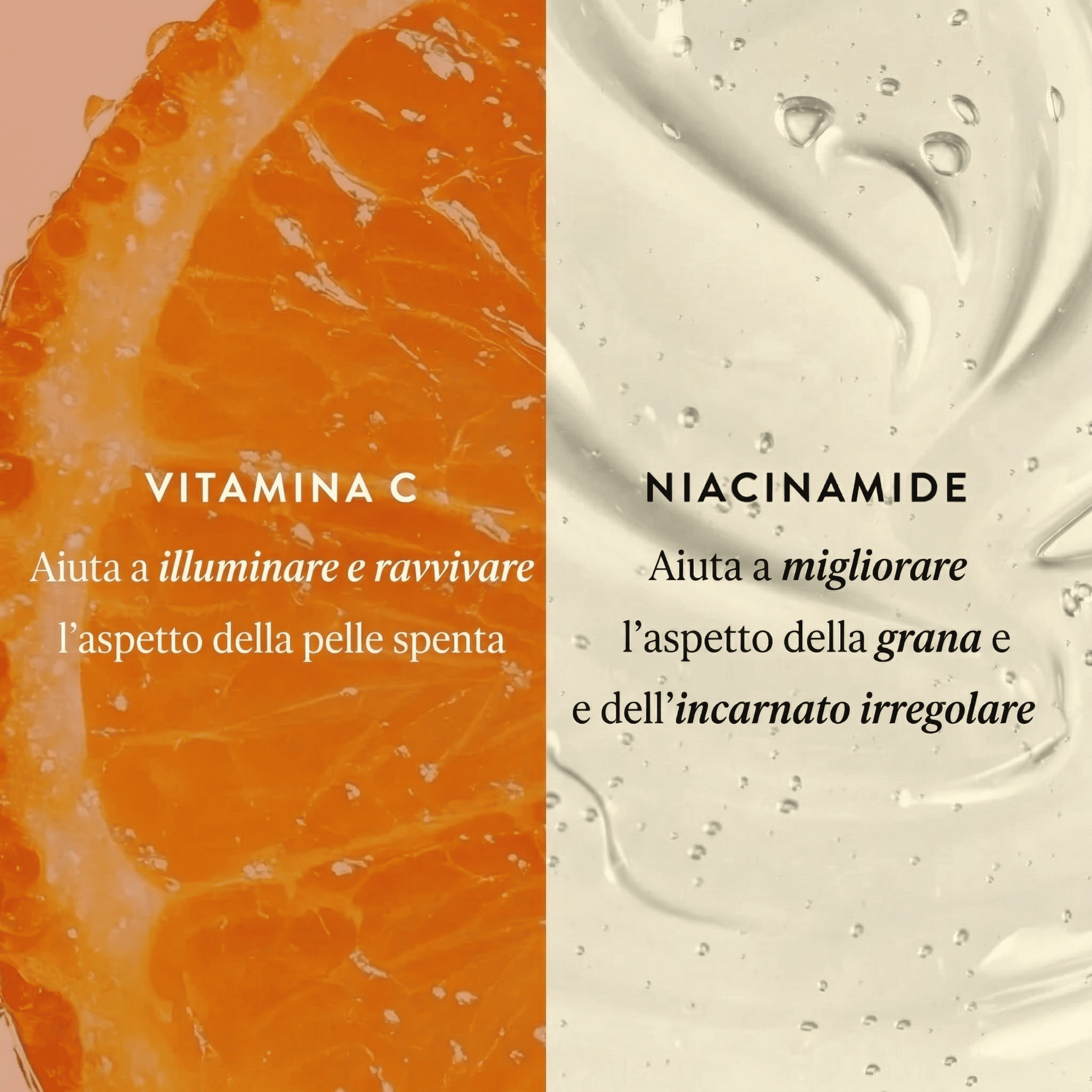 Niacinamide (Vitamina B3) : Affina la grana della pelle e riduce i pori dilatati Vitamina C : Illumina l'incarnato e attenua le macchie scure Polimeri Riempitivi : Effetto tensore immediato che leviga le linee sottili Acido Ialuronico & Glicerina : Idratazione senza effetto cartone