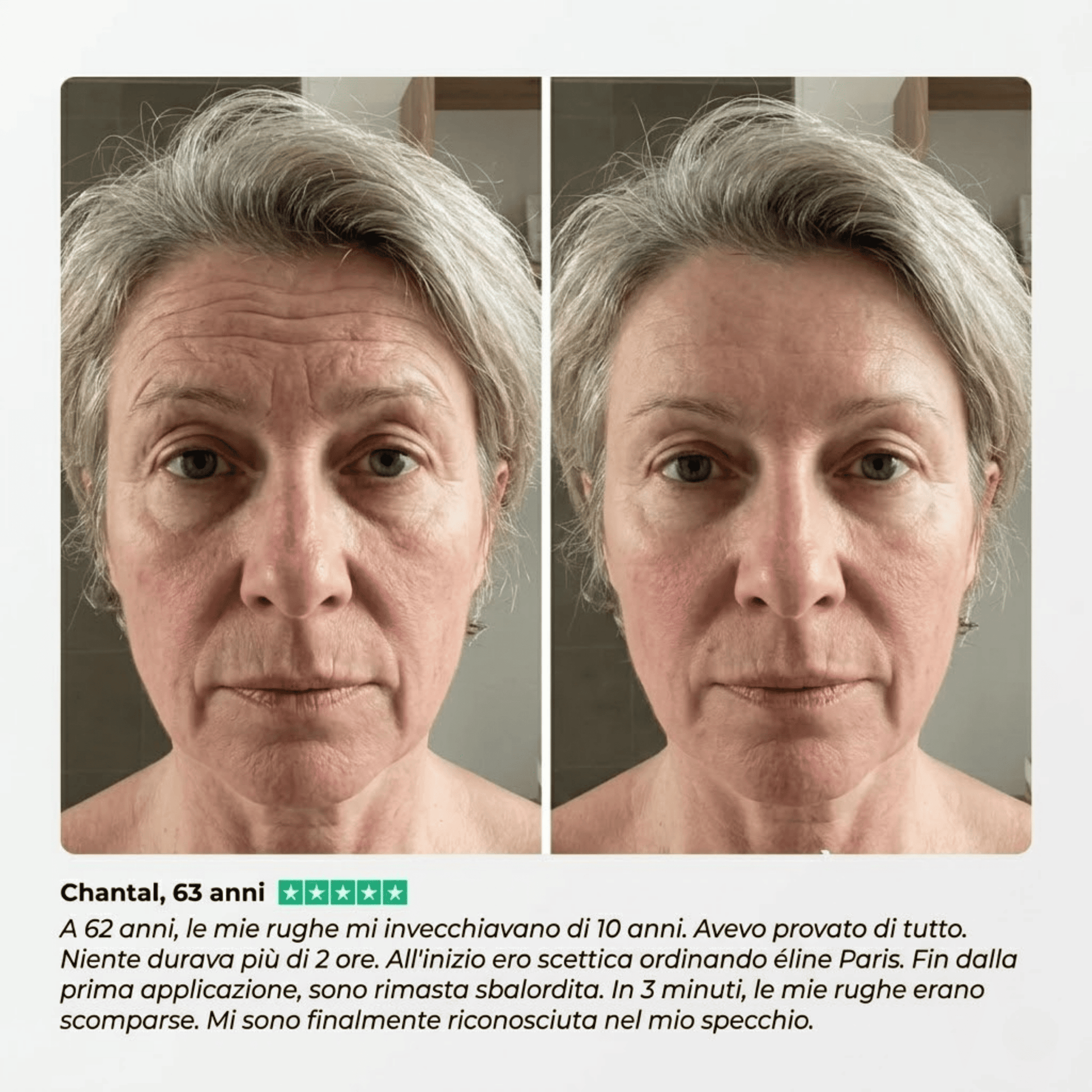 "Prima: passavo 20 minuti a nascondere le rughe con il trucco. Ora: 2 minuti netti. Questo prodotto ha cambiato la mia quotidianità. Lo raccomando al 100%."